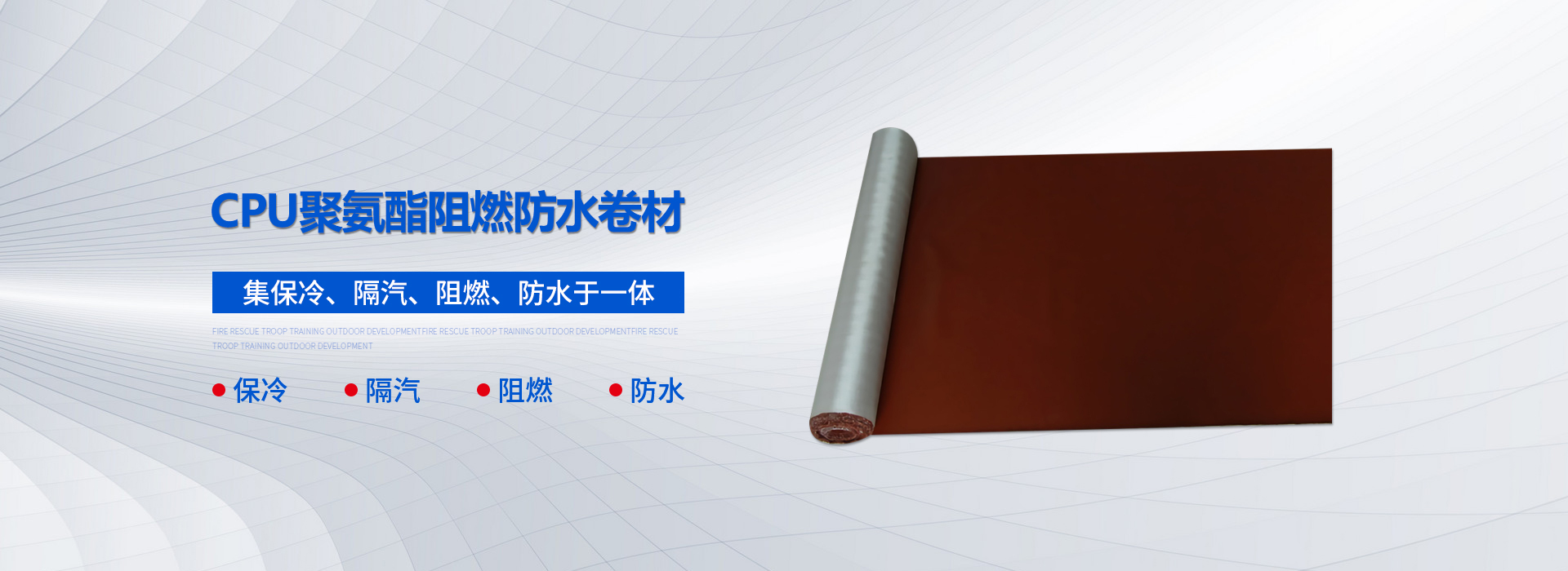 CPU系列彈性卷材以聚氨酯阻燃膠為主要原料,基層采用科學配方經技術處理的增強布作胎基,在特殊的機械加工設備上復合CPU混合料,經硫化、整理卷取等工序制成的高分子阻燃防水卷材。該產品及保冷、隔汽、阻燃、防水于一體,使用壽命長,其阻燃性能處于國內領先水平,填補了國內聚氨酯阻燃防水卷材的空白。